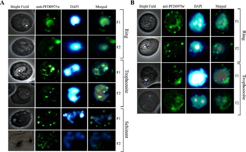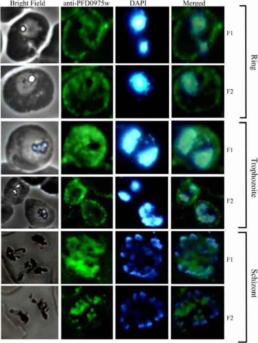 Immunolocalization of PFD0975w in Plasmodiumfalciparum-infected erythrocytes using anti-PFD0975w antibody. Immunolocalization of PFD0975w in Plasmodium falciparum infected RBCs during different asexual RBC stages ofthe life cycle. At the ring stage, the expression signal is moderate whereas it is highest at the trophozoite and then decreases in the schizont stage. In addition, it gradually tapers off as the schizont divides to release its merozoitesץChakraborty A, Balaji SN, Sahasrabuddhe AA, Trivedi V. Cloning, Overexpression, Purification and Immunolocalization of PFD0975w from the malaria parasite Plasmodium falciparum. Infect Disord Drug Targets. 2016 May 6. [Epub ahead of print]