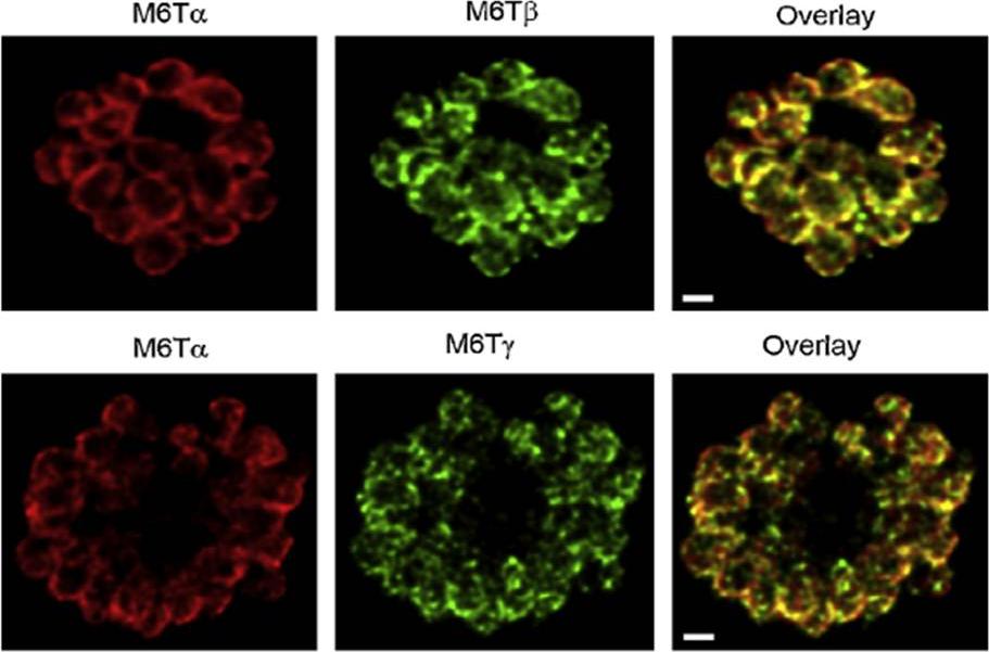 PfM6T proteins localize to the merozoite IMC. Confocal immunofluorescence images demonstrating location of each paralog, as indicated above each image. Images show a separate schizont-infected erythrocyte containing many merozoites; overlay of the red and green channels (rightmost column) shows colocalization of PfM6Ta with each other paralog. Red and green images reflect detection using specific antibodies raised in rabbits and mice, respectively. White scale bars represent 1mm.Rayavara K, Rajapandi T, Wollenberg K, Kabat J, Fischer ER, Desai SA. A complex of three related membrane proteins is conserved on malarial merozoites. Mol Biochem Parasitol. 2009 167:135-43. Copyright Elsevier 2010