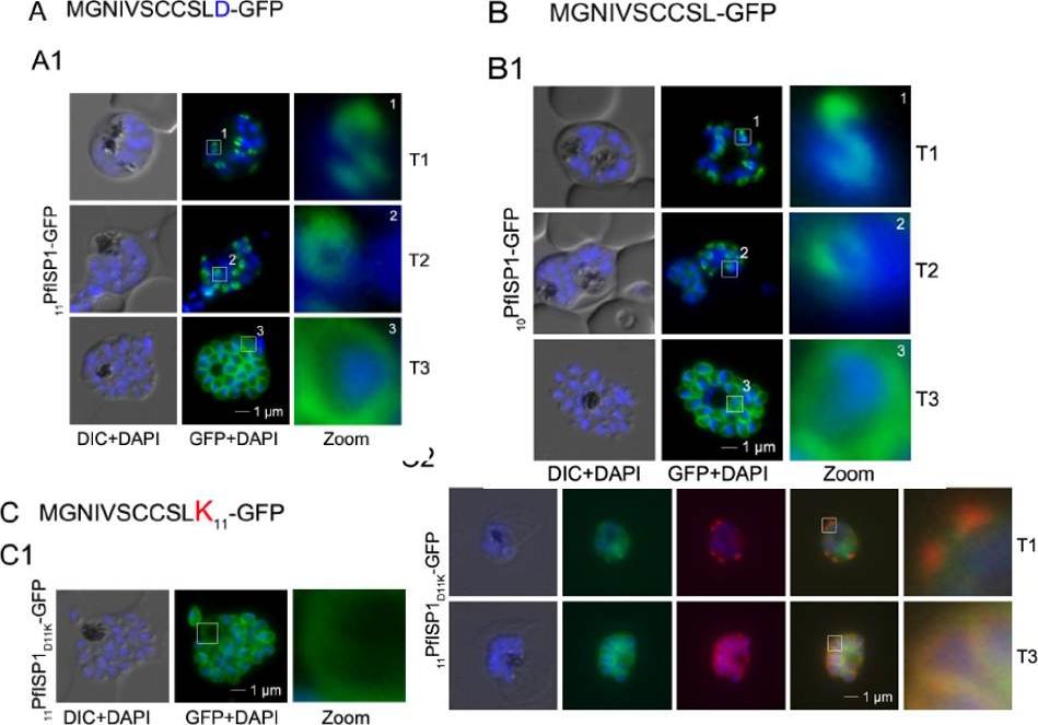 Mutational analysis of the minimal sequence requirements for IMC association of PfISP1. AB. Expression of the first 11 (11PfSP1-GFP, A) or 10 (10PfISP1-GFP, B) amino acids are sufficient to direct GFP to the IMC (A1-B1). C. Substitutionof D11 with lysine (11PfISP1D11K-GFP, C) abolishes IMC targeting (C1) and leads to peripheral localization. The zoom highlights its additional association with the food vacuole membrane consistent with plasma membrane association. C2. Co-localization with the IMC marker GAPM2. Nascent IMC (anti-GAPM2, red) is clearly distinguishable from the peripheral associated 11PfISP1D11K-GFP in early stages (T1) and congruent in late stages (T3). Wetzel J, Herrmann S, Swapna LS, Prusty D, Peter AT, Kono M, Saini S, Nellimarla S, Wong TW, Wilcke L, Ramsay O, Cabrera A, Biller L, Heincke D, Mossman K, Spielmann T, Ungermann C, Parkinson J, Gilberger TW. The role of palmitoylation for protein recruitment to the inner membrane complex of the malaria parasite. J Biol Chem. 2014 Nov 25.