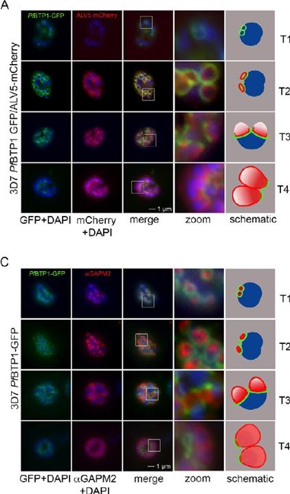 Colocalization of BTP1 with ALV5 and GAPM2 during inner membrane complex (IMC) biogenesis. (A) Colocalization of BTP1–GFP with ALV5–mCherry (red) in unfixed parasites. The initial ring structure marked by BTP1–GFP precedes the appearance of Alveolin 5 (ALV5) (T1). The emerging Alveolin-5-defined ring is associated but distinct from that marked by BTP1 (T2). During IMC expansion, BTP1 remains rim associated (T3) and, at the end of daughter cell formation, is concentrated at the basal end with ALV5 equally distributed within the IMC (T4). (C) Colocalization of BTP1–GFP with GAPM2 (red) in fixed parasites. Both proteins appeared at about the same time, marking the onset of IMC biogenesis (T1). GAPM2 stains small ring–shaped formations that are encircled by BTP1–GFP (T2). With elongation and propagation of the IMC from the apical towards the basal end of the forming daughter cell, GAPM2 is equally distributed within the forming IMC, but BTP1 is only present at the rim of the nascent IMC (T3) and, at the end of schizogony, is concentrated at the basal pole of the daughter cell (T4). Nuclei were stained with DAPI (blue). Enlargement of selected areas are marked with a white square and referred to as ‘zoom’ (a fourfold magnification). The bottom row shows a schematic representation of the spatio-temporal distribution of BTP1 and GAPM2. Kono M, Heincke D, Wilcke L, Wong TW, Bruns C, Herrmann S, Spielmann T, Gilberger TW. Pellicle formation in the malaria parasite. J Cell Sci. 2016 129(4):673-80.