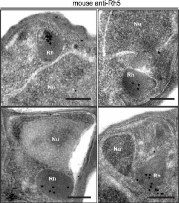 Immuno-electron microscopy of late schizonts localising PfRh5 (using both anti-PfRh5 and anti-HA in the tagged line) to the merozoite rhoptries. Scale bars = 0.2 mm.Baum J, Chen L, Healer J, Lopaticki S, Boyle M, Triglia T, Ehlgen F, Ralph SA, Beeson JG, Cowman AF. Reticulocyte-binding protein homologue 5 - An essential adhesin involved in invasion of human erythrocytes by Plasmodium falciparum. Int J Parasitol. 2009 39:371-80. Copyright Elsevier.