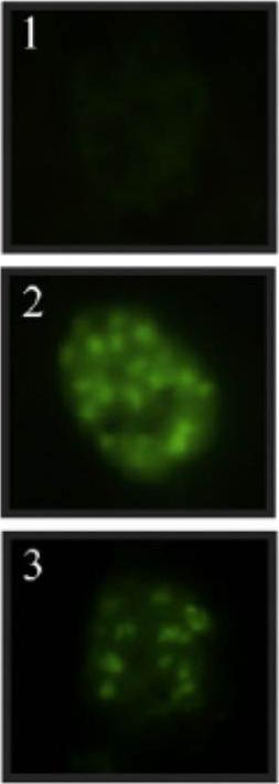 Immunofluorescence detection of the RH5 protein in the P. falciparum FCB-2 strain using rabbit sera as primary antibody and fluorescein (FITC)-labelled anti-rabbit IgG as secondary antibody. (1) Negative control and (2) and (3) apical fluorescence. The antibodies recognized a protein having a point pattern on late-stage schizonts which is typical of apical organelles.Arévalo-Pinzón G, Curtidor H, Muñoz M, Patarroyo MA, Bermudez A, Patarroyo ME. A single amino acid change in the Plasmodium falciparum RH5 (PfRH5) human RBC binding sequence modifies its structure and determines species-specific binding activity. Vaccine. 2011 30(3):637-46