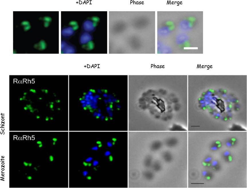 Schizont and merozoite culture was incubated overnight with 0.1µM cytochalasin D to inhibit invasion. Thin smeared on a glass slide, fixed in methanol, stained with Rabbit anti-PfRh5 polyclonal serum 1:200 and secondary Alexa-Flor488 anti-Rabbit. Dual colour fluorescence images were captured using a Carl Zeiss Axioskop 2 microscope at 100x using Oil imersion. Nucleus is marked with DAPI. Scale bar indicate 1µM. PfRh5 localizes to the rhoptries (as shown by immuno-EM).Baum J, Chen L, Healer J, Lopaticki S, Boyle M, Triglia T, Ehlgen F, Ralph SA, Beeson JG, Cowman AF. Reticulocyte-binding protein homologue 5 - An essential adhesin involved in invasion of human erythrocytes by Plasmodium falciparum. Int J Parasitol. 2008 39(3):371-80 . Copyright Elsevier 2009.