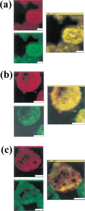 Colocalization of malarial and host proteins in the erythrocyte membrane. A blood smear of erythrocytes infected with the trophozoite stage parasites was fixed and then reacted with two different antibodies (from rabbit and from mouse) against the proteins under study. Secondary antibodies labeled with FITC (anti-rabbit) and TR (anti-mouse) were used, respectively. The left column shows the two simultaneously acquired fluorescence channels by NSOM (near-field scanning optical microscope) dualcolor imaging. The center column presents the corresponding overlay of the fluorescence images (a) Control experiment: primary antibodies against KAHRP. (b) Colocalization of MESA and protein 4.1 (a host cell membrane protein). (c) Colocalization of KAHRP and protein 4.1. Scale bars 5 2 mm.Enderle T, Ha T, Ogletree DF, Chemla DS, Magowan C, Weiss S. Membrane specific mapping and colocalization of malarial and host skeletal proteins in the Plasmodium falciparum infected erythrocyte by dual-color near-field scanning optical microscopy. Proc Natl Acad Sci U S A. 1997 94:520-5.