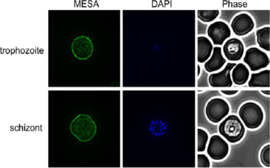 Indirect Immunofluorescence Assay (IFA) was performed using anti-MESA antiserum. Representative IFAs are shown. More diffuse RBC membrane labeling of MESA was detected on trophozoites and schizonts. No labeling was detected in rings (data not shown). PfEMP2/MESA localizes to the RBC membrane.Waller KL, McBride SM, Kim K, McDonald TV. Characterization of two putative potassium channels in Plasmodium falciparum. Malar J. 2008 Jan 24;7:19.
