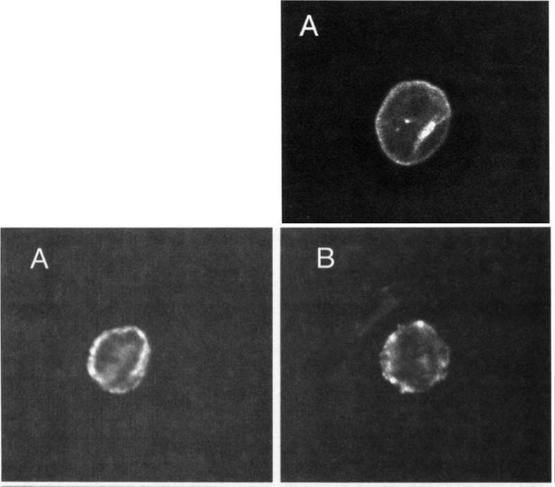 Upper: Localization of MESA. Thin blood smears of mature trophozoite-infected erythrocytes were made from in vitro cultures, air-dried, and fixed with acetonelrnethanol. They were reacted at room temperature for 45 minutes with anti-MESA diluted 1:lOO in PES, washed 3 times in PES, and reacted for 45 minutes with fluorescein isothiocyanate-conjugated goat-antirabbit IgG diluted 1:lOO in PBS. Slides were again washed 3 times in PBS and mounted with SlowFade and a coverslip for examination with a confocal laser scanning microscope equipped with Nikon epifluorescence. Lower: Localization of KAHRP. Cells were prepared and examined as above except that in this case they were reacted with MoAb 89 (antiknob-associated histidine-rich protein) diluted 120 in PBS, followed by fluorescein isothiocyanate-conjugated goat-antimouse IgG diluted 1:lOO in PBS.Magowan C, Coppel RL, Lau AO, Moronne MM, Tchernia G, Mohandas N. Role of the Plasmodium falciparum mature-parasite-infected erythrocyte surface antigen (MESA/PfEMP-2) in malarial infection of erythrocytes.Blood. 1995 86:3196-204.