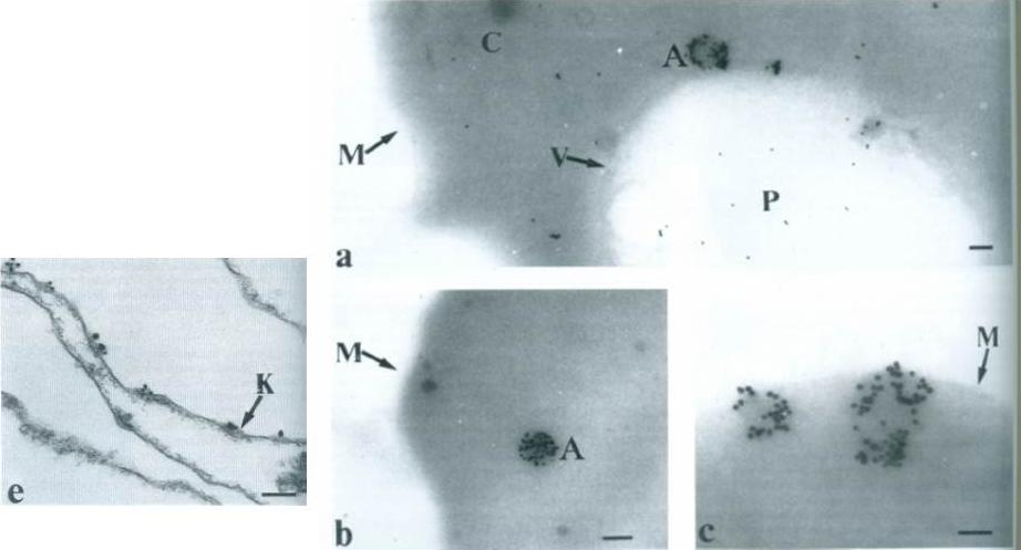 Right: Subcellular localization of PfEMP2 using IgM mAb 4H9.1 by cryo-thin-section immunoelectron microscopy. Electron-dense clumps are seen associated with PfEMP2 antigen,. Bar 0.5 mm. P – parasite; C – erythrocyte cytoplasm; V – parasitophophorous vacuole membrane; M – infected erythrocyte surface membrane.e. Sub-membrane area of knob (K) identified by concavity of surface membrane and electron-dense material. Bar 0.25 mm.Howard RJ, Lyon JA, Uni S, Saul AJ, Aley SB, Klotz F, Panton LJ, Sherwood JA, Transport of an Mr approximately 300,000 Plasmodium falciparum protein (Pf EMP 2) from the intraerythrocytic asexual parasite to the cytoplasmic face of the host cell membrane. J Cell Biol. 1987 May;104(5):1269-80.