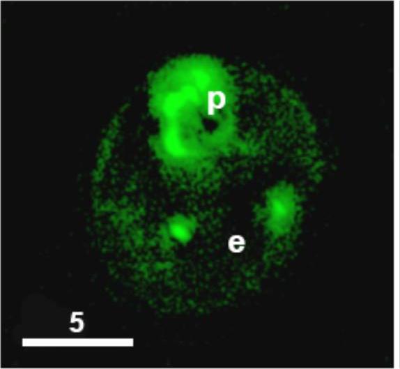 Export of a secretome-predicted parasite HSP40-GFP chimera to the erythrocyte. Projection (0o) of a live cell expressing PfHSP40GFP. Green, GFP; p, parasite; e, erythrocyte. Scale bar 5μm.Hiller NL, Akompong T, Morrow JS, Holder AA, Haldar K. Identification of a stomatin orthologue in vacuoles induced in human erythrocytes by malaria parasites. A role for microbial raft proteins in apicomplexan vacuole biogenesis. J Biol Chem. 2003 278:48413-21.