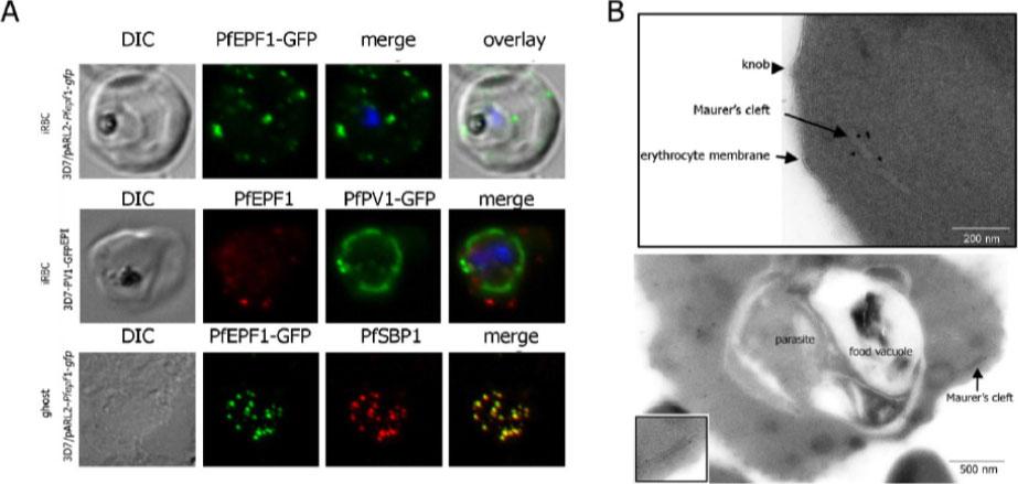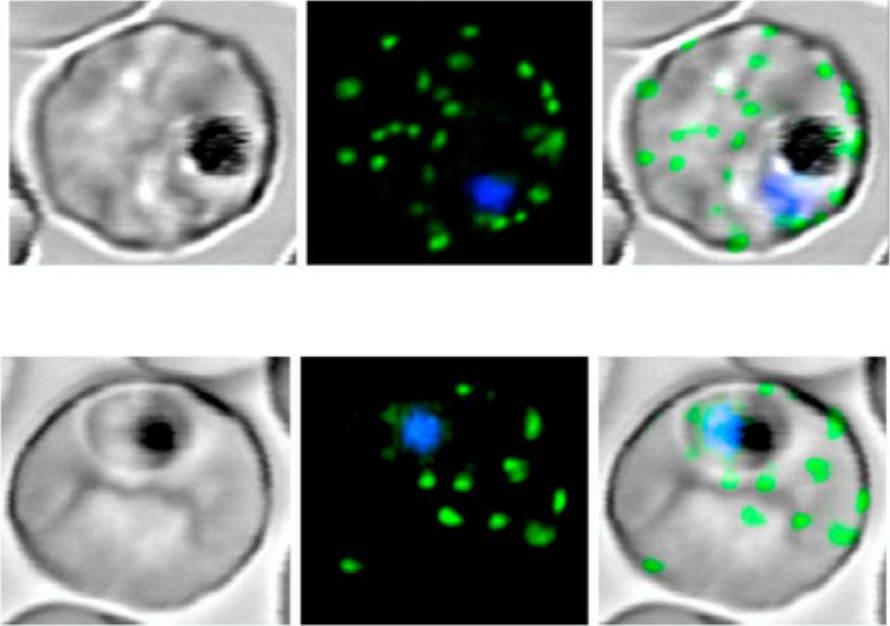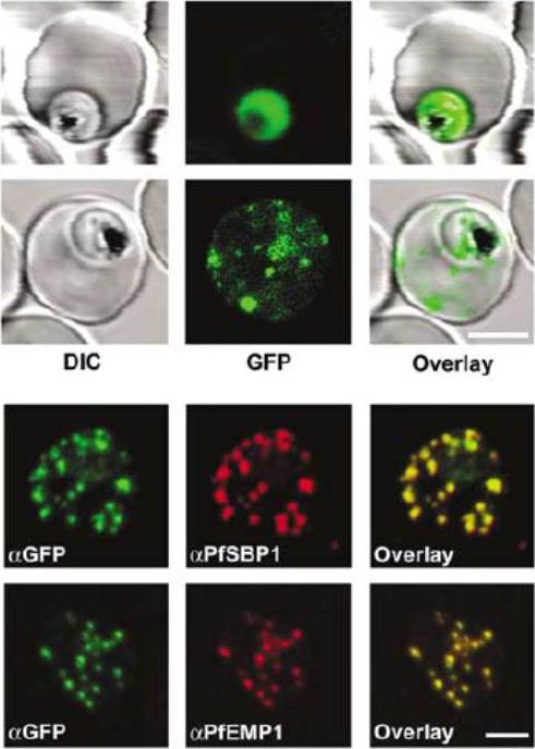 Live P. falciparum-infected erythrocytes were incubated in physiological Ringer’s solution and viewed, at 37 oC, using an LSM510 confocal laser scanning microscope. Confocal images of live P. falciparum-infected erythrocytes expressing SBP. Left images, differential interference contrast (DIC); middle images, GFP fluorescence and nuclear staining with Hoechst; right images, overlay. Scale bar, 4 μm.The right column shows confocal live cell images of P. falciparum-infected erythrocytes expressing MAHRP. Both proteins localize to the Maurer’s clefts.Saridaki T, Fröhlich KS, Breton CB, Lanzer M. Export of PfSBP1 to the Plasmodium falciparum Maurer's clefts. Traffic. 2008 10(2):137-52.