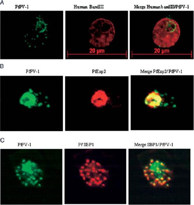 Localization of PfPV-1 in IRBCs. Trophozoite-IRBCs were spread onto microscope slides. Cells were fixed and incubated with mAbs that were directed either against the band 3 protein of the erythrocyte membrane (A), against the vacuolar marker protein PfEXP-2 (B), or against the Maurer’s clefts marker protein PfSBP1 (C). All slides were also incubated with the polyclonal antiserum against PfPV-1. Binding of the mAbs was monitored with Cy3 conjugated anti-mouse secondary antibodies (red), and binding of the polyclonal antiserum was monitored with Cy2 conjugated anti-rabbit secondary antibodies (green). PfPV-1 is concentrated in a distinct ring surrounding the parasite cell, and this location is distinct from that of the erythrocyte membrane (A). It colocalizes with the vacuolar marker protein PfEXP-2 (B) and with PfSBP1 (C), suggesting that it is present not only in the PV but also in Maurer’s clefts.Nyalwidhe J, Lingelbach K. Proteases and chaperones are the most abundant proteins in the parasitophorous vacuole of Plasmodium falciparum-infected erythrocytes. Proteomics. 2006 6:1563-73.