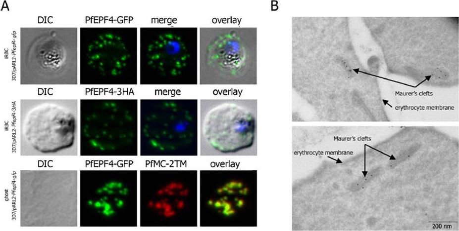 Localization and topology of the PfEPF4 proteins. A. Fluorescent patterns of iRBCs infected by 3D7/pARL2-Pfepf4-gfp (live imaging) and 3D7/pARL2-Pfepf4-3HA (immunodetection using anti-HA antibodies) and of resealed ghosts from 3D7/pARL2-Pfepf4-gfp iRBCs (GFP fluorescence, in green, and immunodetection using anti-PfMC-2TM antibodies, in red). RBCs and ghost preparations were incubated with DAPI for nucleus labelling. B. Immunoelectron microscopy using anti-GFP antibodies. PfEPF4 (A) display a pattern of fluorescent dots in the iRBC cytoplasm. PfEPF4-GFP colocalized with a Maurer’s cleft transmembrane protein, PfSBP1 or PfMC-2TM2 when resealed ghosts from iRBCs were analysed by immunofluorescence. The localization of PfEPF4 at the Maurer’s clefts was confirmed by immunoelectron-microscopy.Mbengue A, Audiger N, Vialla E, Dubremetz JF, Braun-Breton C. Novel Plasmodium falciparum Maurer's clefts protein families implicated in the release of infectious merozoites. Mol Microbiol. 2013 88(2):425-42