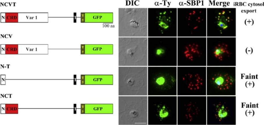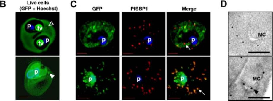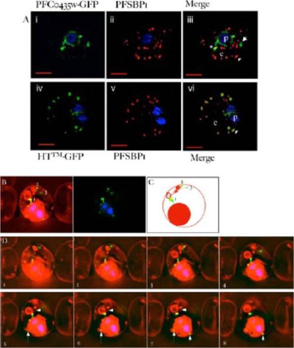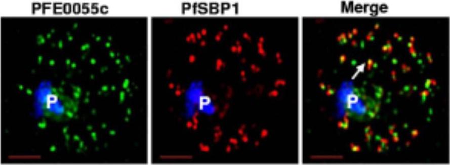 Upper panel: PFD0495c is exported to the erythrocyte. (iii) fluorescence image of pfd0495c-gfp expressing parasites. Fluorescence image of pfd0495c-gfp expressing parasites (iv) fluorescence and DIC image showing export ofPDF0495c chimera to the erythrocyte (e) periphery (arrow) andintraerythrocytic spots (arrowhead).Lower panel: PFD0495c is found within intraerythrocytic structures. 3D7 early schizonts were fixed and probed with antibodies to PFD0495c (i) and Skeleton Binding Protein (SBP1; ii) for immunofluorescence. Endogenous PFD0495c is found associated with the parasite and within intraerythrocytic structures, vesicular (arrowhead) and tubular (arrow) structures, distinct from Maurer’s Clefts (iii).Tamez PA, Bhattacharjee S, van Ooij C, Hiller NL, Llinás M, Balu B, Adams JH, Haldar K. An erythrocyte vesicle protein exported by the malaria parasite promotes tubovesicular lipid import from the host cell surface. PLoS Pathog. 2008 Aug 8;4(8):e1000118.
