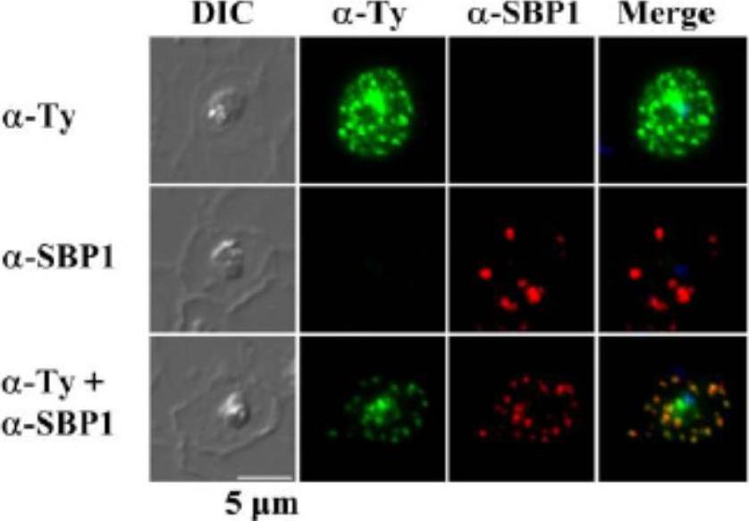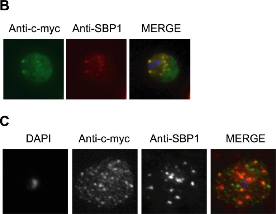 Immunolocalization of c-myc epitope-tagged PFE1605w PHIST protein within infected erythrocytes. B) Co-localization was assayed using rabbit polyclonal SBP1 followed by goat anti-rabbit IgG conjugated with Alexa 594 (red). C) The pattern of expression of c-myc epitope tagged PFE1605w PHIST protein is dependent on the fixation protocol. When infected erythrocytes are fixed in solution with 1% paraformaldehyde, 0.075% glutaraldehyde, then PHIST protein shows a broader punctate expression than the Maurer’s cleft marker, SBP1. At the late ring stage, PHIST proteins were observed exported to the erythrocyte cytoplasm, at least in partial co-localization with the marker of Maurer’s clefts, SBP1 (B). PFE1600w was abundantly observed in the ER of late stage parasites (data not shown); and it is possible that this localization represents aberrant trafficking due to over-expression of the transcript and thereby protein, perhaps due to the use of a heterologous promoter. The localization to the erythrocyte cytoplasm validates trafficking that is predicted by the presence of a PEXEL/HT motif.Moreira CK, Naissant B, Coppi A, Bennett BL, Aime E, Franke-Fayard B, Janse CJ, Coppens I, Sinnis P, Templeton TJ. The Plasmodium PHIST and RESA-Like Protein Families of Human and Rodent Malaria Parasites. PLoS One. 2016 11(3):e0152510