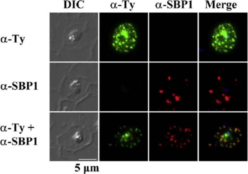 Subcellular localization of rSURFIN4.1Full (3D7A) in P. falciparum-infected red blood cells. Representative fluorescence images showing the localization of rSURFIN4.1Full. The differential interference contrast (DIC), fluorescence image with mouse anti-Ty antibody (α-Ty; recognizing rSURFIN4.1), Maurer's clefts location with rabbit anti-SBP1 antibody (α-SBP1), and merged image with nucleus staining with DAPI (Merge) are shown. rSURFIN4.1Full exhibits a dotted fluorescence pattern within the red blood cell cytosol, co-localized with PfSBP1. Bar=5 μm.Zhu X, Yahata K, Alexandre JS, Tsuboi T, Kaneko O. The N-terminal segment of Plasmodium falciparum SURFIN4.1 is required for its trafficking to the red blood cell cytosol through the endoplasmic reticulum. Parasitol Int. 2012 62(2):215-229.
