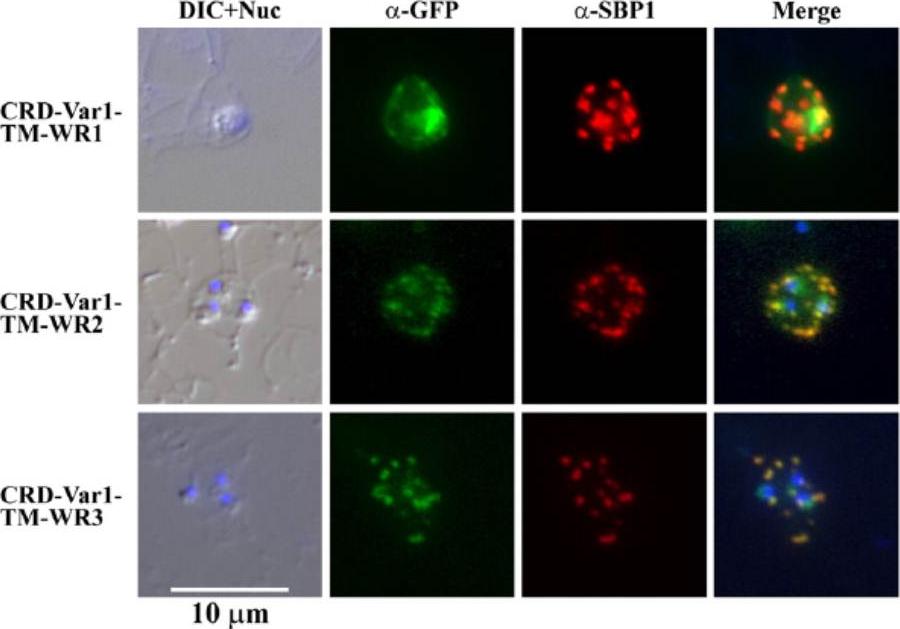 Indirect immunofluorescence assay of three mini-SURFIN4.2 proteins. Double staining IFA for 3 mini-SURFIN4.2-expressing transfectants is shown. α-GFP and α-SBP1 indicate anti-GFP (mini-SURFIN4.2) and anti-SBP1 (Maurer's cleft protein). Negative controls using normal rabbit antibody did not produce detectable signals (not shown). CRD, cysteine-rich domain; TM, transmembrane; and Var1, variable region 1; WR, tryptophan-rich.Alexandre JS, Yahata K, Kawai S, Torii M, Kaneko O. PEXEL-independent trafficking of Plasmodium falciparum SURFIN(4.2) to the parasite-infected red blood cell and Maurer's clefts. Parasitol Int. 2011 60(3):313-20.