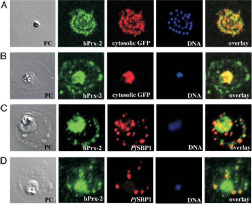 Confocal laser scanning IFA colocalization analyses of hPrx-2 in infected RBCs. (A) IFA colocalization of hPrx-2 (human peroxiredoxin 2) with cytosolic GFP in P. falciparum late schizont/ merozoites. The surrounding RBC is lysed and merozoites are about to be released. Phase contrast (PC) shows the residual hemozoin crystal and merozoites. DNA staining (blue) visualizes 28 merozoites. Cytosolic GFP (red) stains the merozoites and anti-hPrx-2-staining shows presence of hPrx-2 in merozoites (hPrx-2, green). ‘‘Overlay’’ shows a weak colocalization of GFP and hPrx-2. (B) IFA colocalization analysis of hPrx-2 in a trophozoite. PC shows the parasite and the FV containing hemozoin. Anti-hPrx-2-staining (green) reveals the presence of the protein in the trophozoite cytosol as it colocalizes with cytosolic GFP (red). (C and D) IFA colocalization of hPrx-2 with PfSBP1 in P. falciparum trophozoites. PfSBP1 (red) stains the MCs of the trophozoite. Anti-hPrx-2-staining shows presence of hPrx-2 in parasite cytosol and focal staining in the RBC (hPrx-2, green). ‘‘Overlay’’ shows colocalization of hPrx-2 and PfSBP1 in the Maurer’s Clefts.Koncarevic S, Rohrbach P, Deponte M, Krohne G, Prieto JH, Yates J 3rd, Rahlfs S, Becker K. The malarial parasite Plasmodium falciparum imports the human protein peroxiredoxin 2 for peroxide detoxification. Proc Natl Acad Sci U S A.2009 106:13323-8. PMID: