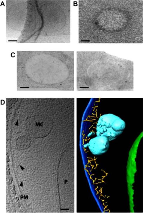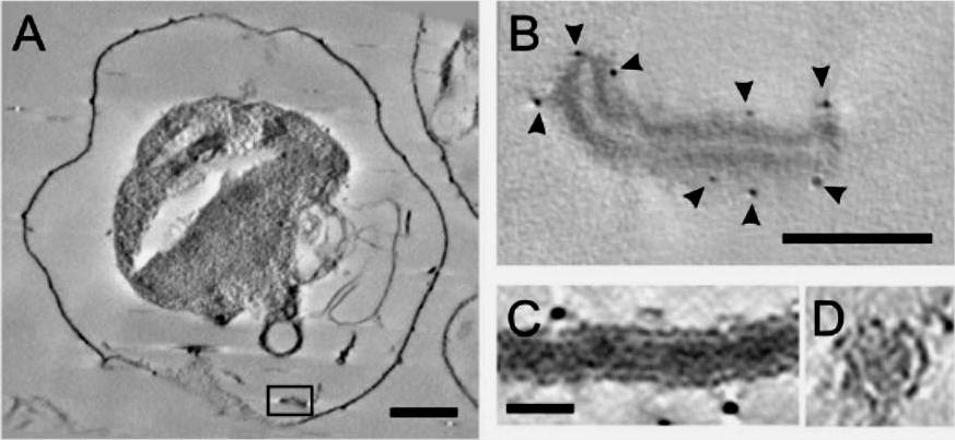 Electron tomography of individual Maurer’s cleft bodies, tubules and vesicles in a Plasmodium falciparum strain 3D7-infected red blood cell (RBC). (A) A virtual section with an individual Maurer’s cleft marked with a rectangle, which is depicted at higher resolution in (B). The presence of the gold particles (arrowheads) indicates labelling with antibodies recognising the Maurer’s cleft resident, skeleton-binding protein-1 (SBP1). (C and D) Virtual sections showing transverse (C) and cross-section (D) views through a tubular structure. Scale bars: (A) 1 mm; (B) 100 nm; (C and D) 25 nm..Hanssen E, Carlton P, Deed S, Klonis N, Sedat J, Derisi J, Tilley L. Whole cell imaging reveals novel modular features of the exomembrane system of the malaria parasite, Plasmodium falciparum. Int J Parasitol. 2010 40:123-134. Copyright Elsevier 2010.