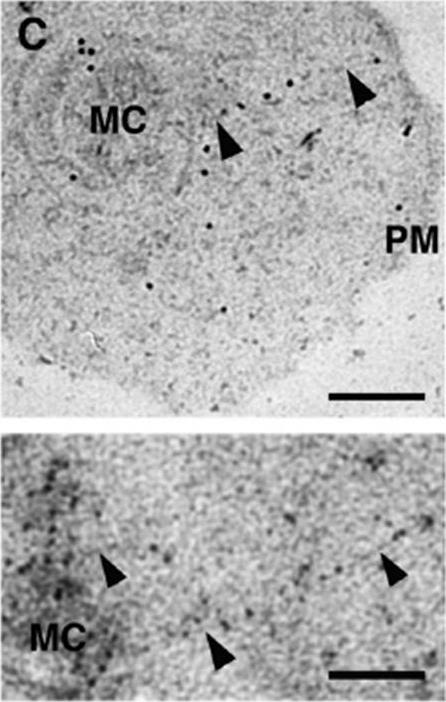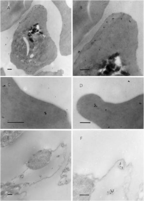 Post-embedding immunoelectron microscopy using 6B4 monoclonal. Panoramic view of an infected erythrocyte (A) and higher magnification images (B–D) showing the preferential location of gold particles over Maurer’s clefts. Panels (E) and (F) arephotographs of ‘parasite ghosts’ probed with 6B4, showing the reaction of the monoclonal antibody over cytoplasmic vesicles. Bar indicates 0.2 mm. Immunoelectron microscopy demonstrated that the monoclonal antibody reacts with cytoplasmic vesicles of Plasmodium falciparum infected erythrocyte referred to as Maurer’s clefts. 6B4 recognized 50 and 41 kDa antigens. The 50 kDa antigen is most probably PfSBP1.Martinez SL, Clavijo CA, Winograd E. Identification of peripheral membrane proteins associated with the tubo-vesicular network of Plasmodium falciparum infected erythrocytes. Mol Biochem Parasitol. 1998 91:273-80. Copyright Elsevier 2009.