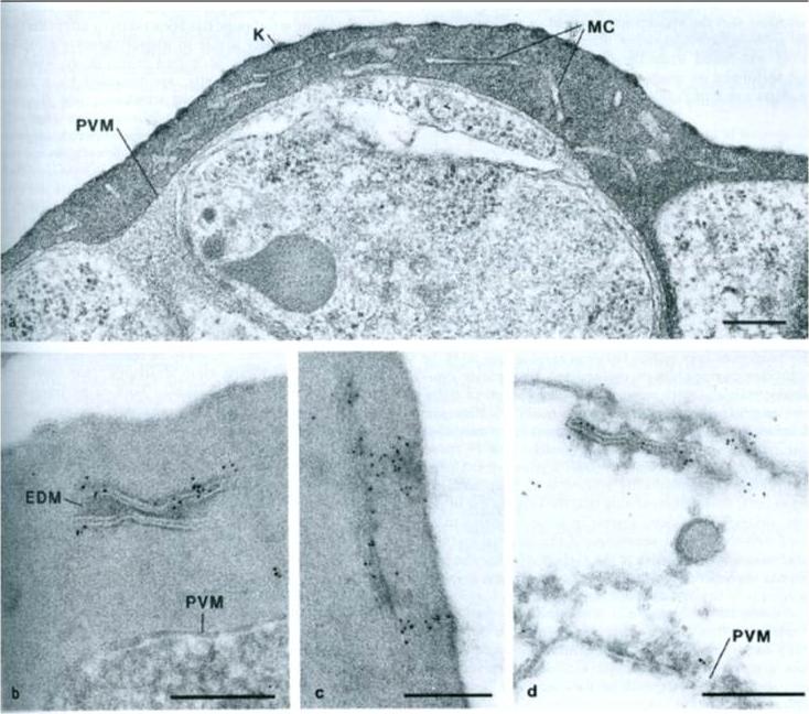 a) Morphology of and infected cell. PVM – parasitophorous vacuole membrane; MC – Maurer’s clefts; K – knob structures. b) immunolabeling showing gold particles over Maurer’s clafts. EDM – electron dense material. c) Localization of gold particles over Maurer’s clefts, adjacent to plasma membrane. d) Tris-lysed infected cell, gold particles distributed over membranes of Maurer’s clefts. Bar 200 nm.Etzion Z, Perkins ME. Localization of a parasite encoded protein to erythrocyte cytoplasmic vesicles of Plasmodium falciparum-infected cells. Eur J Cell Biol. 1989 48:174-9.