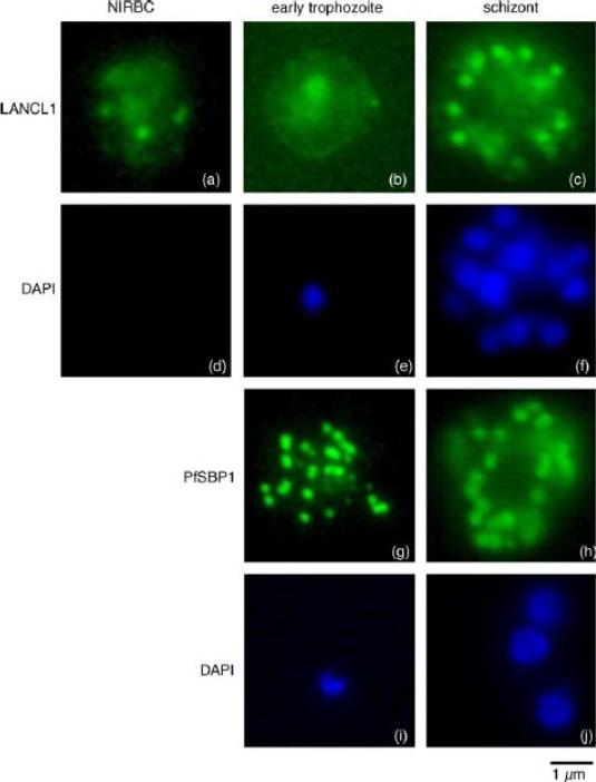 Immunofluorescence localisation of LANCL1 in uninfected and P. falciparum-infected erythrocytes. Un-infected erythrocytes and P. falciparum-infected erythrocytes at different stages of the parasite intra-erythrocytic cycle were fixed and permeabilized. Immunofluorescence analyses were performed using the rabbit H60 LANCL1-specific serum, and a mouse serum raised against the carboxy-terminal domain of PfSBP1. DAPI staining of the nuclei assessed the stage of the intra-erythrocytic parasite (in blue). In uninfected erythrocytes (a) and early trophozoites (b) a pattern consistent with a cytosolic localization and spots of aggregation of LANCL1 is observed. In P. falciparum schizonts (c), an additional labelling similar to that obtained with PfSBP1-specific antibodies (g and h) is observed, suggesting a Maurer’s cleft-like localization of LANCL1.Blisnick T, Vincensini L, Barale JC, Namane A, Braun Breton C. LANCL1, an erythrocyte protein recruited to the Maurer's clefts during Plasmodium falciparum development. Mol Biochem Parasitol. 2005 141:39-47. Copyright Elsevier 2010.