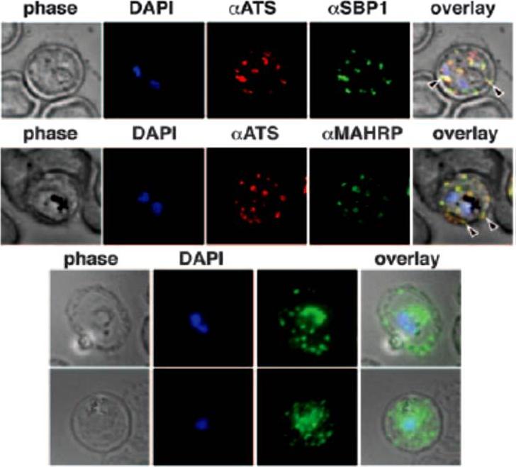 A. tage dependent co-localization of PfHsp70-x and PfEMP1. Upper infected cell (ring stage) shows a higher degree of signal colocalization than lower infected cell (trophozoite). B. ndirect immuno-fluorescence of PfHsp70-x and PfEMP1 using confocal microscopy. In merge and overlay: Green, α-70x; Red, α-ATS; Blue, Hoechst. C. ndirect immuno-fluorescence localization of PfHsp70-x using anti-SBP1, anti-MAHRP2 and anti-STEVOR (STV) antisera in cells infected with 3D7GFP:70x. In merge and overlay images: Green, GFP; red, specific antisera; Blue, Hoechst. No co-localization can be observed between the GFP and antibody-specific signals.Külzer S, Charnaud S, Dagan T, Riedel J, Mandal P, Pesce ER, Blatch GL, Crabb BS, Gilson PR, Przyborski JM. Plasmodium falciparum-encoded exported hsp70/hsp40 chaperone/co-chaperone complexes within the host erythrocyte. Cell Microbiol. 2012 14(11):1784-95