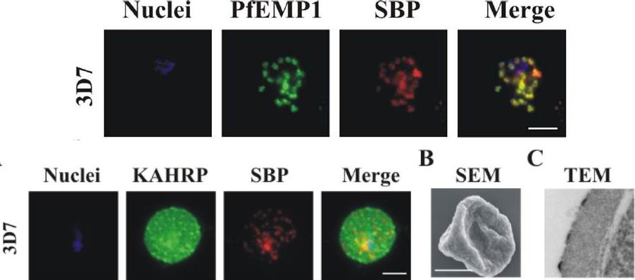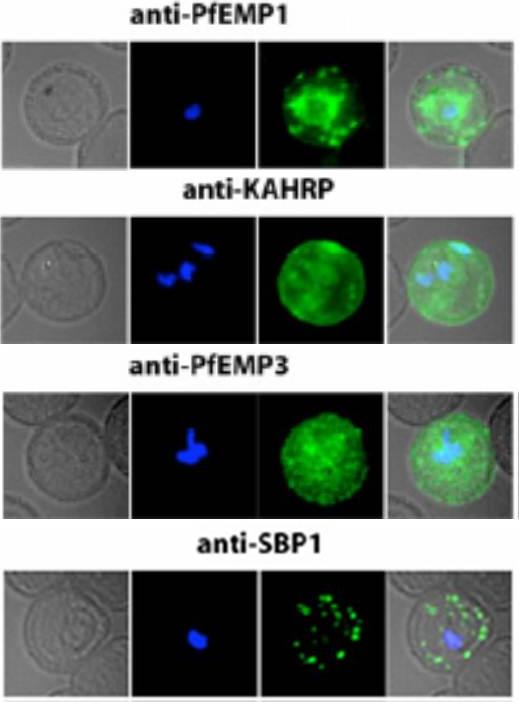 Localization of PfEMP1, KAHRP, PfEMP3 and SBP1 in P. falciparum-infected erythrocytes. The first column of each panel shows a bright-field image, the second panel specific antibody and the third panel overlay of the previous two and a nuclear stain (DAPI). PfEMP1 displays and functions on the surface of infected erythrocytes. KAHRP and PfEMP3 are exported to the erythrocyte cytoplasm and interacts with Maurer’s clefts and eventually reach the inner side of the host cell membrane. SBP1 is a Maurer’s clefts resident protein.Maier AG, Rug M, O'Neill MT, Brown M, Chakravorty S, Szestak T, Chesson J, Wu Y, Hughes K, Coppel RL, Newbold C, Beeson JG, Craig A, Crabb BS, Cowman AF. Exported proteins required for virulence and rigidity of Plasmodium falciparum-infected human erythrocytes. Cell. 2008 134:48-61.