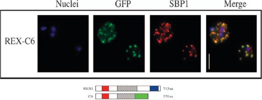 Transgenic parasites were fixed using acetone and detected with anti-GFP and anti-SBP1 antibodies. The panel shows REX-C6 colocalizations, GFP fluorescence of the chimeric protein in green and SBP1 fluorescence in red. The merge panel on the right shows complete colocalization of the two cleft proteins, confirming the presence of REX–GFP at the Maurer’s clefts.Dixon MW, Hawthorne PL, Spielmann T, Anderson KL, Trenholme KR, Gardiner DL. Targeting of the ring exported protein 1 to the Maurer's clefts is mediated by a two-phase process. Traffic. 2008 9:1316-26.
