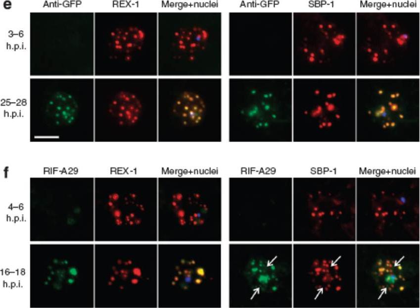 Export of membrane proteins is independent of cleft formation. IFA showing that in REX2-GFPcrt-expressing parasites (e) and 3D7 (f), early clefts contain REX1 and but not REX2-GFPcrt (e, upper panels) or RIFIN A29 (RIF-A29, f, upper panels). On progress of the culture to the trophozoite stage, the clefts containing REX1 and now also contain REX2-GFPcrt (e, lower panel) and RIFIN A29 (f, lower panel). Dots positive for RIFIN A29 only, found in ~50% of cells, are indicated by white arrows. Scale bars, 5 μm; h.p.i., hours post invasion. the clefts in early stages contained only the early markers (e,f). In contrast, later stages were positive for all four antigens (e,f). Crucially, in later stages all antigens occupied the same clefts (e,f), demonstrating that the clefts initially containing REX1 and SBP1 accumulated the other proteins later on. This establishes that export occurred without cleft formation.Grüring C, Heiber A, Kruse F, Ungefehr J, Gilberger TW, Spielmann T. Development and host cell modifications of Plasmodium falciparum blood stages in four dimensions. Nat Commun. 2011 2:165.