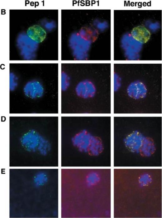 Colocalization studies with anti-peptide 1 antibodies and fixed 3D7 pRBCs (late trophozoites and schizonts). Parasite nuclei were stained with DAPI (blue). Double staining was carried out with MAb 61.2 against a 52-kDa rhoptry protein (red) and anti-peptide 1 serum (green) (A) and with mouse serum (B28) against the 77-kDa carboxy terminus of MC protein PfSBP1 (red) and anti-peptide 1 serum (STEVOR; green) (B to E). Schizonts progressd from binucleate to multinucleate in panels B to E, as determined by staining of nuclear material. Anti-peptide 1 serum was detected by using FITC conjugated goat anti-rabbit IgG. Colocalizing antibody was detected by using Texas red-conjugated goat anti-mouse IgG. Magnification, x1,000. Antibodies against STEVOR recognize proteins of the expected size (37 kDa) and localize STEVOR in Maurer’s clefts, unique membranous structures located in the cytoplasm of infected erythrocytes. Kaviratne M, Khan SM, Jarra W, Preiser PR. Small variant STEVOR antigen is uniquely located within Maurer's clefts in Plasmodium falciparum-infected red blood cells. Eukaryot Cell. 2002 1:926-35.