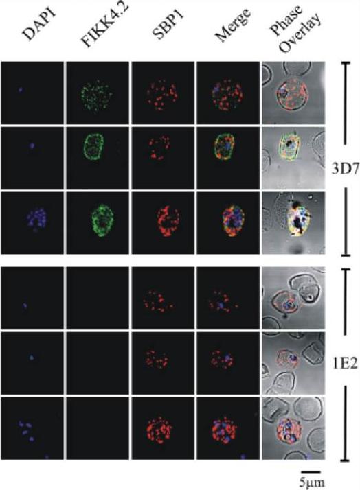 Immunofluorescence analysis of red blood cells infected with parental (3D7) or FIKK4.2 knockout (1E2) parasites. Experiments were performed on infected red blood cells that had been synchronised at either the young ring stage or the more mature trophozoite/schizont stage. Air-dried and fixed blood smears on glass slides were dual-labelled with both a-FIKK4.2 and a-SBP1 (Maurer’s cleft) antibodies. Merge and phase overlay images demonstrate clearly that FIKK4.2 and SBP1 do not co-localise in infected red blood cells. Specific punctate fluorescence was observed in the cytoplasm of RBCs infected with ring-stage 3D7 parasites. A similar pattern was observed in RBCs infected with trophozoite/schizont-stage parasites, and although the pattern of fluorescence was more diffuse, individual puncta were still clearly discernible. The puncta appeared too small and too numerous to be Maurer’s clefts, and did not co-localise with either the classical Maurer’s cleft marker SBP1.Kats LM, Fernandez KM, Glenister FK, Herrmann S, Buckingham DW, Siddiqui G, Sharma L, Bamert R, Lucet I, Guillotte M, Mercereau-Puijalon O, Cooke BM. An exported kinase (FIKK4.2) that mediates virulence-associated changes in Plasmodium falciparum-infected red blood cells. Int J Parasitol. 2014 Feb 14. [Epub ahead of print]