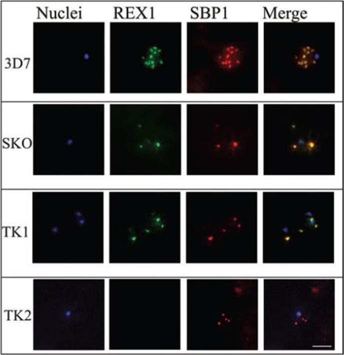 Immunofluorescence microscopy of paraformaldehyde-fixed RBCs infected with 3D7, SKO, TK1 or TK2 parasites probed with anti-REX166-169 antiserum and anti-SBP1. The nuclei were visualized with Hoechst staining. Bar is 5 mm. Maurer’s clefts are observed as punctate structures in the RBC cytoplasm in 3D7 parasites labelled with the known Maurer’s cleft protein, SBP1 or with the antiserum against REX166-169 (top row). By contrast, RBCs infected with D10 parasites are not labelled with either REX1 antiserum (data not shown). In the SKO (second row), the antiserum against REX166-169 also recognized the truncated REX1 protein at the Maurer’s clefts. However, an antiserum against the C-terminal region does not recognize the truncated REX1 protein. The Maurer’s clefts location was confirmed by dual labelling with anti-SBP1 antiserum (second row).Hanssen E, Hawthorne P, Dixon MW, Trenholme KR, McMillan PJ, Spielmann T, Gardiner DL, Tilley L. Targeted mutagenesis of the ring-exported protein-1 of Plasmodium falciparum disrupts the architecture of Maurer's cleft organelles. Mol Microbiol. 2008 69(4):938-53