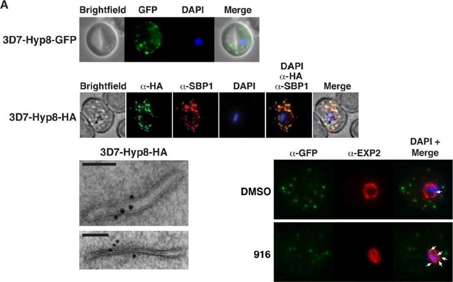 PMV inhibition impairs protein export, PfEMP1 display, and cytoadherence. (A) (Top) Immunofluorescent micrographs show Hyp8-GFP (exported protein hyp8),is exported and localizes within puncta in the infected erythrocyte. (Middle) Hyp8-HA localizes within SBP1-containing MCs. (Right) Immunoelectron microscopy shows Hyp8-HA localization at MCs. Scale bar is 100 nm. Immunofluorescence microscopy showed Hyp8-GFP is exported and colocalizes with SBP1 in MCs(B) Maximum intensity projection micrographs showing export of Hyp8-GFP to MCs and secretion of EXP2 to the parasitophorous vacuole membrane following treatment with DMSO or 916 (50 mM). Puncta of nonexported GFP within the parasite and vacuole is shown (arrows)Sleebs BE, Lopaticki S, Marapana DS, O'Neill MT, Rajasekaran P, Gazdik M, Günther S, Whitehead LW, Lowes KN, Barfod L, Hviid L, Shaw PJ, Hodder AN, Smith BJ, Cowman AF, Boddey JA. Inhibition of Plasmepsin V Activity Demonstrates Its Essential Role in Protein Export, PfEMP1 Display, and Survival of Malaria Parasites. PLoS Biol. 2014 12(7):e1001897.