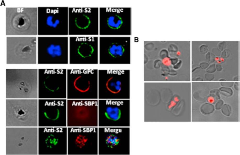 Analysis of STEVOR Expression in the 3D7DMAHRP1 Parasites -parasite line in which the disruption of the mahrp1 gene has been shown to compromise trafficking of PfEMP1 to the iRBC surface allowing any adhesion or binding phenotype to be attributed to parasite ligands other than PfEMP1. Live IFA with anti-S1 and anti-S2 (anti-STEVOR Abs) showed that trafficking of STEVOR to the 3D7DMAHRP1-iRBC surface was not impaired. (A) Detection of STEVOR on live 3D7DMAHRP1-R+ -iRBCs surface by anti-S1 and anti-S2 (top panel). Dual staining of live 3D7DMAHRP1-R+ -iRBCs with anti-S2 and anti-GPC antibodies (bottom panel, top row) or anti-SBP1 (bottom panel, middle row) illustrating the external location of both STEVOR and GPC (Glycophorin C). SBP1 internal location revealed by IFA on fixed parasites (bottom panel, bottom row). Only surface-expressed STEVOR was detected by live IFA of iRBCs, as staining with antibody against the internally located Maurer’s clefts protein SBP1 was negative while dual IFA on fixed parasites showed double labeling of STEVOR and SBP1(B) Live wet-preparation images showing successful rosetting enrichment of 3D7DMAHRP1 line.Niang M, Bei AK, Madnani KG, Pelly S, Dankwa S, Kanjee U, Gunalan K, Amaladoss A, Yeo KP, Bob NS, Malleret B, Duraisingh MT, Preiser PR. STEVOR Is a Plasmodium falciparum Erythrocyte Binding Protein that Mediates Merozoite Invasion and Rosetting. Cell Host Microbe. 2014 16(1):81-93. PMID: 25011110