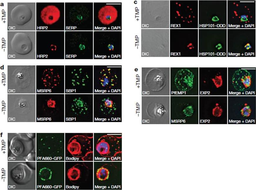 HSP101 is required for export of PEXEL and PNEP proteins. a, c, Immunofluorescence assay (IFA) of ring-stage 13F10 parasites with orwithout TMP (DDD-stabilizing small molecule trimethoprim). TMP was removed in late schizont stage and parasites were allowed to reinvade and grow 18–24 h before fixation with paraformaldehyde (a) or acetone (c). a, IFA of the exported PEXEL-containing protein HRP2. c, IFAs of the PNEP REX1, which colocalizes with HSP101DDD at the PVM in the absence of TMP. d, e, IFA of trophozoite-stage 13F10 parasites with or withoutTMP. TMP was removed in late ring stage and parasites were allowed to develop 12–24 h before fixation with acetone. f, Live fluorescence imaging of 13F10 parasites expressing a PFA660–GFP fusion and labelled with Bodipy TR Ceramide to demarcate the PVM (other membranes are also labelled). TMP treatment as in d, e. All scale bars, 5 mm. Images in c–f are representative of two independent experiments.Beck JR, Muralidharan V, Oksman A, Goldberg DE. PTEX component HSP101 mediates export of diverse malaria effectors into host erythrocytes. Nature. 2014 Jul 16. [Epub ahead of print]
