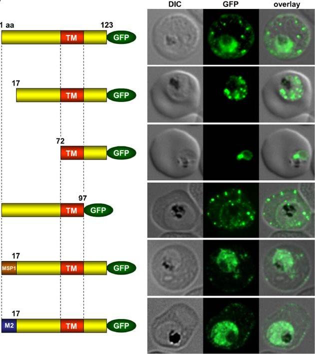 Immunofluorescence assays of MeOH-fixed RBCs infected with SEMP1-KO parasites expressing full-length and truncated or mutated forms of SEMP1 C-terminally fused to GFP. Expressed SEMP1 was labelled with rabbit a-GFP antibodies. The transmembrane domain is depicted in red (TM), a MSP1 signal peptide in brown (MSP1) and the MAHRP2 N-terminus in blue (M2). deletion of the complete C-terminus of SEMP1 (SEMP11–97-GFP) did not impair export and resulted in correct localisation whilst deletion of the first 16 amino acids (SEMP117–123-GFP) of the N-terminus resulted in an impaired export from the parasite. The deletion of 71 amino acids (SEMP172–123-GFP) of the N-terminus prevented export and seemed to have resulted in concentration of SEMP1 in or at the endoplasmic reticulum. If the first 16 amino acids of SEMP1 were replaced by the corresponding amino acids of MAHRP2 (M21–16SEMP117–123-GFP) or the classical signal peptide of MSP1 (MSP11–16SEMP117–123-GFP) the fusion protein was exported in both cases albeit with lower efficiency.Dietz O, Rusch S, Brand F, Mundwiler-Pachlatko E, Gaida A, Voss T, Beck HP. Characterization of the Small Exported Plasmodium falciparum Membrane Protein SEMP1. PLoS One. 2014 9(7):e103272.