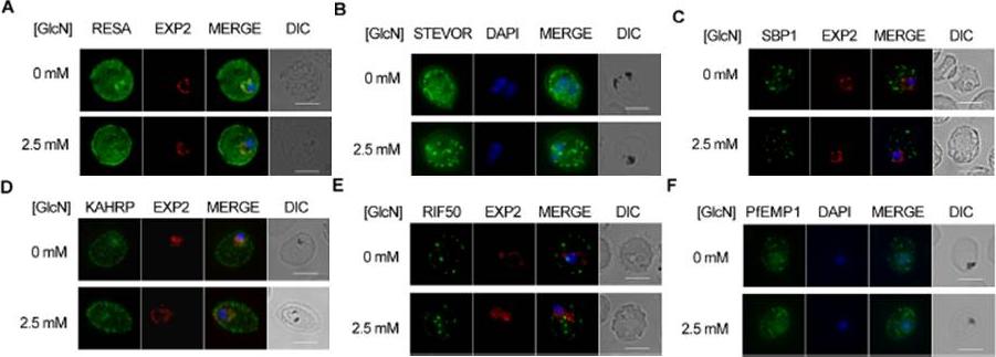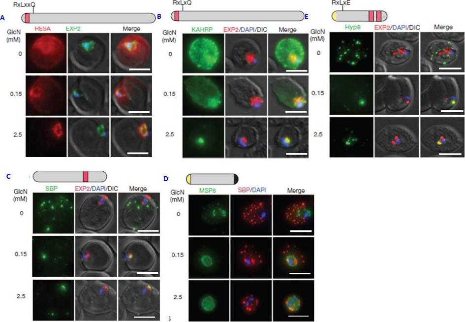PTEX150 knockdown blocks protein export in P. falciparum. a–e, IFAs (right) and graphs (left) showing a decrease in the export of RESA (a) and KAHRP (b) and of SBP1 (c) and Hyp8 (d) (Maurer’s clefts, MCs) cells for each antibody or GlcN concentration) but similar levels of MSP8 (e) after treatment with GlcN. Scale bars, 5 mm. A strong blockage in export was seen at both 2.5mM and 0.15mM glucosamine in PTEX150-HAglmS parasites (a, b, c and d). No effect on either MSP8 expression or localization to the parasite membrane was observed (e).Elsworth B, Matthews K, Nie CQ, Kalanon M, Charnaud SC, Sanders PR, Chisholm SA, Counihan NA, Shaw PJ, Pino P, Chan JA, Azevedo MF, Rogerson SJ, Beeson JG, Crabb BS, Gilson PR, de Koning-Ward TF. PTEX is an essential nexus for protein export in malaria parasites. Nature. 2014 Jul 16. [Epub ahead of print] PMID: 25043043