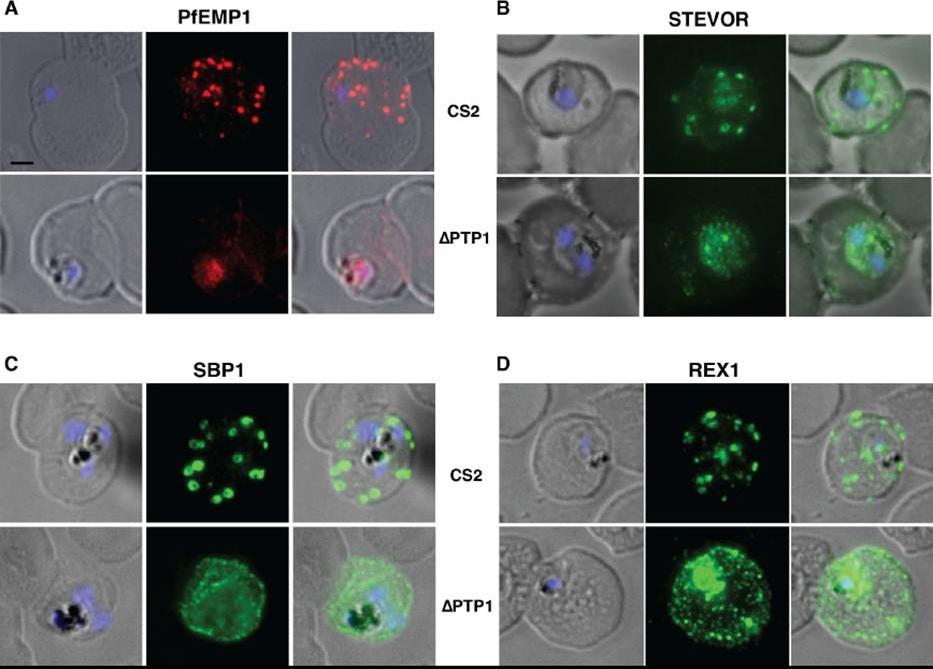 Immunofluorescence assay on CS2 (upper panels) versus CS2ΔPTP1 parasites (lower panels). Immunofluorescence assay probed with a-PfEMP1 antibody (A), a-STEVOR antibody (B), a -SBP 1 antibody (C) and a -REX 1 antibody (D). Scale bar: 1 μm; same size of ROI in each image. In CS2ΔPTP1 the architecture of MC was disrupted showing large aggregated globular structures. SBP1 and REX1 were located on these structures reflecting the results obtained by IFA.Rug M, Cyrklaff M, Mikkonen A, Lemgruber L, Kuelzer S, Sanchez CP, Thompson J, Hanssen E, O'Neill M, Langer C, Lanzer M, Frischknecht F, Maier AG, Cowman AF. Export of virulence proteins by malaria-infected erythrocytes involves remodelling of host actin cytoskeleton. Blood. 2014 Aug 19 [Epub ahead of print]