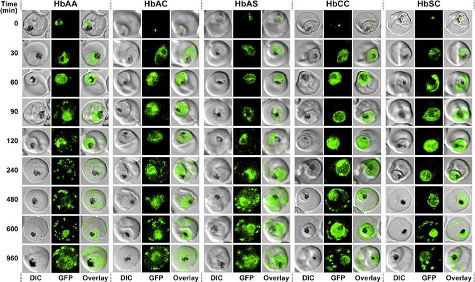 Kinetics of export of PfSBP1CAD in various P. falciparum-infected erythrocytes. P. falciparum-infected erythrocytes were taken from culture at the time points indicated after the addition of the anti-aggregation ligand and immediately analyzed by live cell confocal fluorescence microscopy. Tightly synchronized cultures at the trophozoite-stage (18–22 h post invasion) were used.Kilian N, Srismith S, Dittmer M, Ouermi D, Bisseye C, Simpore J, Cyrklaff M, Sanchez CP, Lanzer M. Hemoglobin S and C affect protein export in Plasmodium falciparum-infected erythrocytes. Biol Open. 2015 4(3):400-10.