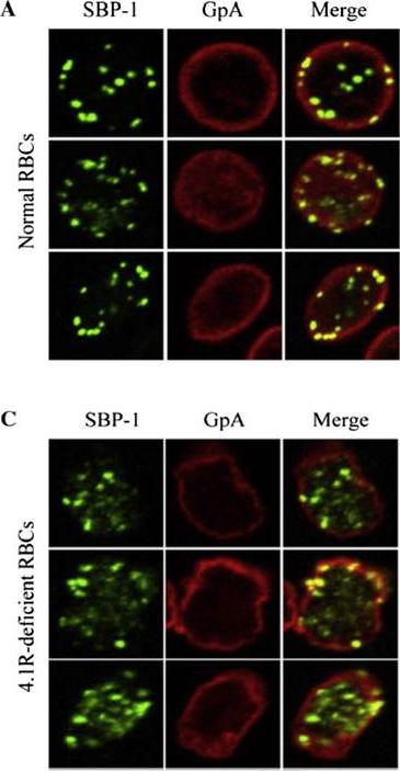 Localisation of SBP-1 in normal and protein 4.1R-deficient red blood cells. Representative confocal immunofluorescence images of normal (A) and 4.1R-deficient (C) RBCs immunolabelled for Maurer's clefts (SBP1; green) and the RBCmembrane skeleton (Glycophorin A, GpA; red). This data strongly supports that the interaction between SBP1-C and protein 4.1R plays a significant role in localising Maurer's clefts to their final destination in the PRBC, tethered to the RBC membrane skeleton.Kats LM, Proellocks NI, Buckingham DW, Blanc L, Hale J, Guo X, Pei X, Herrmann S, Hanssen EG, Coppel RL, Mohandas N, An X, Cooke BM. Interactions between Plasmodium falciparum skeleton-binding protein 1 and the membrane skeleton of malaria-infected red blood cells. Biochim Biophys Acta. 2015 Apr 1848(7):1619-1628. PMID: