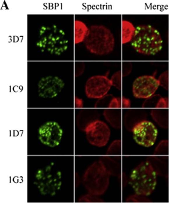 Functional analysis of the SBP1 C-terminal domain. A. Representative images from immunofluorescence analysis RBCs infected with wild type 3D7 parasites or the three clonal parasite lines for the SBP1–AMA1-C chimeras (clones 1C9, 1D7 and 1G3 expressing chimeric SBP1 comprising the N-terminal domain of SBP1 and the C-terminal domain of AMA1 (SBP1–AMA1-C). Green represents SBP1 and red is spectrin. Distribution of the chimeras in PRBCs was not significantly different to that found in wild type, parental 3D7 parasites.Kats LM, Proellocks NI, Buckingham DW, Blanc L, Hale J, Guo X, Pei X, Herrmann S, Hanssen EG, Coppel RL, Mohandas N, An X, Cooke BM. Interactions between Plasmodium falciparum skeleton-binding protein 1 and the membrane skeleton of malaria-infected red blood cells. Biochim Biophys Acta. 2015 Apr 1848(7):1619-1628.