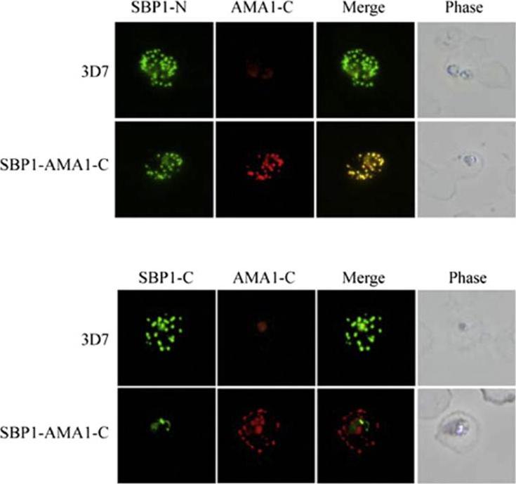 Localisation of SBP1 C-terminal mutants. Immunofluorescence analysis of RBCs infected with either normal (3D7) or transgenic parasites expressing a chimeric SBP1 protein in which the C-terminal domain of SBP1 was replaced with the C-terminal domain of P. falciparum AMA1 (SBP1–AMA1-C). Chimeras localised this protein correctly to Murer’s Clefts. Kats LM, Proellocks NI, Buckingham DW, Blanc L, Hale J, Guo X, Pei X, Herrmann S, Hanssen EG, Coppel RL, Mohandas N, An X, Cooke BM. Interactions between Plasmodium falciparum skeleton-binding protein 1 and the membrane skeleton of malaria-infected red blood cells. Biochim Biophys Acta. 2015 1848(7):1619-1628.