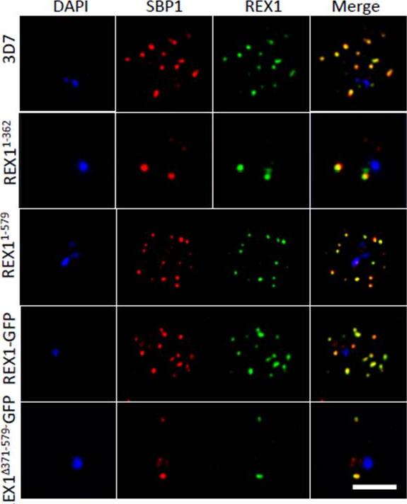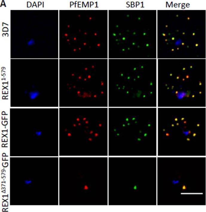 Deletion of the repeat region of REX1 decreases the number of Maurer's cleft puncta. A. Immunofluorescence microscopy of acetone-fixed infected RBCs probed with anti-SBP1 (red) and anti-REX1 (green). Nuclei are stained with DAPI (blue). Scale bar = 3 μm. Full-length REX1-GFP is correctly localized at the Maurer's clefts and that these transfectants exhibit an average number of puncta equivalent to that of the 3D7 parent. By contrast, the REX1Δ371-579-GFP parasites exhibited a striking Maurer’s cleft phenotype, with only 2 + 0.3 punctate structures observed in the infected RBC cytoplasm.McHugh E, Batinovic S, Hanssen E, McMillan PJ, Kenny S, Griffin MD, Crawford S, Trenholme KR, Gardiner DL, Dixon MW, Tilley L. A repeat sequence domain of the ring-exported protein-1 of Plasmodium falciparum controls export machinery architecture and virulence protein trafficking. Mol Microbiol. 2015 Aug 24. [Epub ahead of print]