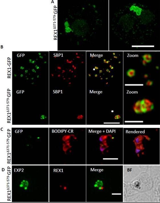 REX1(Δ371–579)-GFP parasites exhibit giant Maurer’s clefts. A. REX1(Δ371–579)-GFPinfected RBCs fixed with paraformaldehyde, permeabilized with EqtII and labelled with anti-GFP. B. REX1-GFP and REX1(Δ371–579)-GFP-infected RBCs were fixed with paraformaldehyde/glutaraldehyde and probed with anti-GFP (green) and anti-SBP1 (red). Samples were examined using 3D-SIM. 3D-SIM reveals giant Maurer's clefts with an apparently convoluted surfaceC. REX1(Δ371–579)-GFP-infected RBCs were labelled with BODIPY-ceramide, fixed with paraformaldehyde/ glutaraldehyde, labelled with DAPI and imaged using widefield deconvolution microscopy. The right hand panel shows rendering of the surface of the 3D structure using Imaris software. REX1Δ371-579-GFP appears to accumulate at discrete regions of the PVM as does EXP-2. D. REX1(Δ371–579)-GFP-infected RBCs were fixed with paraformaldehyde/ glutaraldehyde and probed with anti-EXP2 (green) and anti-REX1 (red). Samples were examined using deconvolution microscopy. Scale bars = 3 μm; zoom bar = 1 μm.McHugh E, Batinovic S, Hanssen E, McMillan PJ, Kenny S, Griffin MD, Crawford S, Trenholme KR, Gardiner DL, Dixon MW, Tilley L. A repeat sequence domain of the ring-exported protein-1 of Plasmodium falciparum controls export machinery architecture and virulence protein trafficking. Mol Microbiol. 2015 Aug 24. [Epub ahead of print] PMID: