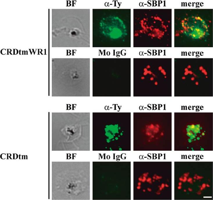 Indirect immunofluorescence assay of recombinant CRDtmWR1 (recombinant SURFIN4.2 proteins containing intracellular region) and CRDtm (recombinant SURFIN4.2 proteins not containing intracellular region). CRDtmWR1 and CRDtm were dual stained with mouse anti-Ty antibody (α-Ty, green; Monoclonal antibody raised in mouse against the Ty1 tag (amino acid sequence EVHTNQDPLD) for recombinant SURFIN4.2 and rabbit anti-PfSBP1 serum (α-SBP1, red) for Maurer’s clefts. Dual staining negative control images with mouse normal IgG (Mo IgG) and anti-PfSBP1 are also shown. Bright field images (BF) are shown, as well as merged images (merge) of α-Ty, α-SBP1, and DAPI (blue) DNA staining. The bar = 2 μm.Kagaya W, Miyazaki S, Yahata K, Ohta N, Kaneko O. The Cytoplasmic Region of Plasmodium falciparum SURFIN4.2 Is Required for Transport from Maurer's Clefts to the Red Blood Cell Surface. Trop Med Health. 2015 Dec;43(4):265-72.