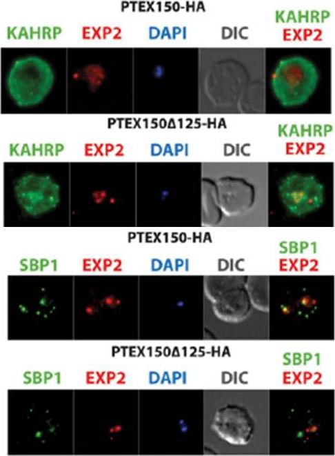 The export of KAHRP and SBP1 in the PTEX150Δ125-HA mutant compared to full length PTEX150-HA parasites. PTEX150-HA and PTEX150Δ125-HA parasites were synchronized to an invasion window of 5 h. The regions occupied by the parasite are indicated by DAPI and EXP2 staining. KAHRP is a PEXEL protein, which initially displays a diffuse staining of the erythrocyte cytosol before accumulating in punctate regions below the plasma membrane of the host cell. SBP is a PNEP that localizes to punctate vesicular structures called Maurer’s clefts (MC) in the host cytosol. IFAs were counterstained with antibodies to EXP2 to delineate where the boundaries of the parasite. No significant difference between the PTEX150Δ125-HA and PTEX150-HA parasite lines was observed.Elsworth B, Sanders PR, Nebl T, Batinovic S, Kalanon M, Nie CQ, Charnaud SC, Bullen HE, de Koning Ward TF, Tilley L, Crabb BS, Gilson PR. Proteomic analysis reveals novel proteins associated with the Plasmodium protein exporter PTEX and a loss of complex stability upon truncation of the core PTEX component, PTEX150. Cell Microbiol. 2016 18(11):1551-1569.