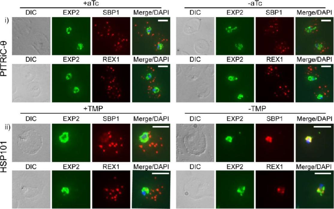 Loss of PfTRiC-θ does not alter export of PfSBP1 or PfREX1. IFA of acetone-fixed ring-stage infected RBC. i) PfTRiC-θ ± 0.5 μM aTc (anhydrotetracycline), ii) HSP101 ± 10 μM trimethoprim (TMP). DAPI stains the parasite nuclei and PfEXP2 delineates the parasite parasitophorous vacuole compartment. Scale bars = 5 μm. Data are representative of two independent assays. DIC = differential interference contrast. Loss of the PfTRiC complex does not alter export of PfSBP1 or PfREX1 (i). This was in contrast to the block in export of PfSBP1 and PfREX1 observed upon TMP removal in the previously characterized PfHSP101-DDD line (ii).Spillman NJ, Beck JR, Ganesan SM, Niles JC, Goldberg DE. The chaperonin TRiC forms an oligomeric complex in the malaria parasite cytosol. Cell Microbiol. 2017 Jan 9.