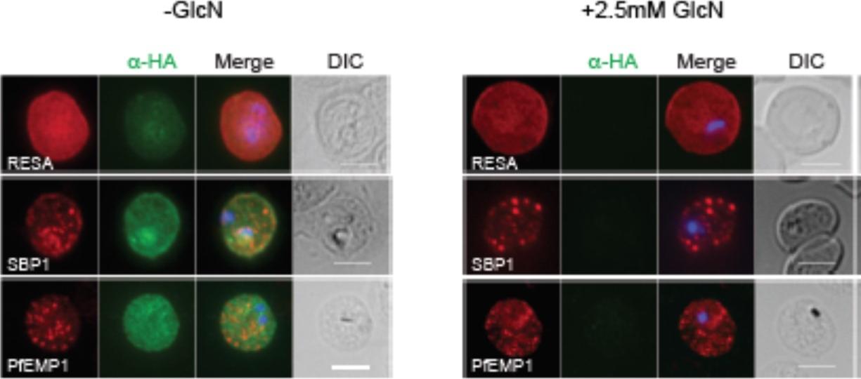 RhopH2 is not involved in the trafficking of exported proteins in the erythrocyte cytoplasm. (a) Representative IFAs of erythrocytes infected with RhopH2-HAglmS parasites grown in 0 mM or 2.5 mM GlcN using the indicated antibodies show trafficking of RESA, SBP1 and PfEMP1 is unaffected upon RhopH2 knockdown. Scale bar = 5 μm. No defect in the export of PfEMP1, or trafficking of either RESA to the erythrocyte membrane or SBP1 to the Maurer’s clefts was evident after knocking down RhopH2 expression with GlcN.Counihan N, Chisholm SA, Bullen HE, Srivastava A, Sanders PR, Jonsdottir TK, Weiss GE, Ghosh S, Crabb BS, Creek DJ, Gilson PR, de Koning-Ward TF. Plasmodium falciparum parasites deploy RhopH2 into the host erythrocyte to obtain nutrients, grow and replicate. Elife. 2017 Mar 2;6. pii: e23217.