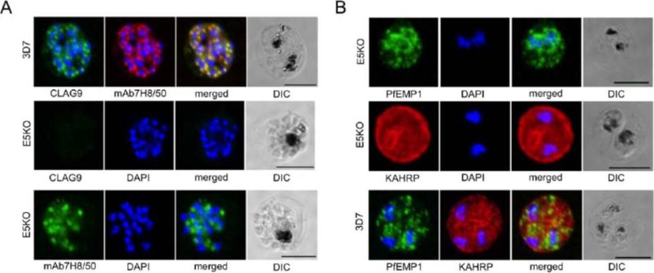 A. Labeling of CLAG9 in 3D7 and E5KO. Note there is labeling of E5KO (clag9 knockout) rhoptries with mAb7H8/50 that reveals RAP3, but not with anti-CLAG9 specific sera due to gene disruption. Scale bars = 5 mm. B. Trafficking of PfEMP1 and KAHRP by E5KO; labeling was identical to 3D7. Scale bars = 5 mm. CLAG9 was not detected in the knockout clone E5KO. These results show that the clag9 gene product is not directly implicated in cytoadhesion to CD36.Nacer A, Roux E, Pomel S, Scheidig-Benatar C, Sakamoto H, Lafont F, Scherf A, Mattei D. clag9 is not essential for PfEMP1 surface expression in non-cytoadherent Plasmodium falciparum parasites with a chromosome 9 deletion. PLoS One. 2011;6(12):e29039.