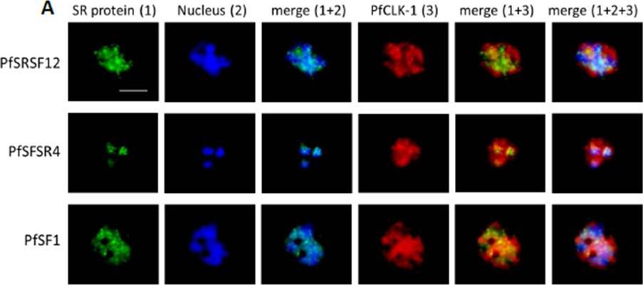 Co-localization and control IFAs. A. Immunolabelling of PfCLK-1 with rabbit antisera (red) detected the kinase in the schizonts´ cytoplasm as well as in the nuclei, where it co-localizes with the three SR proteins (green). Schizonts were counterlabelled with rabbit antibodies against PfMSP-1 (red). All nuclei were highlighted by Hoechst staining (blue). Bar, 5 μm. The co-localization experiments confirmed that the SR proteins are solely present in the nuclei, while in the early schizont stage, PfCLK-1 is present both in the parasite nuclei and the cytoplasm. Co-localization of PfCLK-1 with the three SR proteins can be detected in distinct nuclear regions. Kern S, Agarwal S, Huber K, Gehring AP, Strödke B, Wirth CC, Brügl T, Abodo LO, Dandekar T, Doerig C, Fischer R, Tobin AB, Alam MM, Bracher F, Pradel G. Inhibition of the SR Protein-Phosphorylating CLK Kinases of Plasmodium falciparum Impairs Blood Stage Replication and Malaria Transmission. PLoS One. 2014 Sep 4;9(9):e105732.