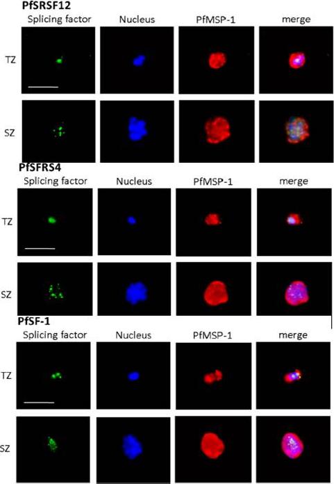 Subcellular localization of the SR proteins in the blood stage. Mixed asexual blood stage cultures containing trophozoites (TZ) and schizonts (SZ) cultures were fixed with paraformaldehyde and prepared for IFA, using mouse antisera against PfSRSF12, PfSFRS4 and PfSF-1 (green). The parasite nuclei were highlighted by Hoechst staining (blue). The parasites were labelled with rabbit antisera against PfMSP-1. Bar, 5 mm. IFAs detected the three SR proteins in the trophozoite nucleus (top rows). An additional minor labelling was observed in the nuclei of the schizont stages (center rows).Kern S, Agarwal S, Huber K, Gehring AP, Strödke B, Wirth CC, Brügl T, Abodo LO, Dandekar T, Doerig C, Fischer R, Tobin AB, Alam MM, Bracher F, Pradel G. Inhibition of the SR Protein-Phosphorylating CLK Kinases of Plasmodium falciparum Impairs Blood Stage Replication and Malaria Transmission. PLoS One. 2014 Sep 4;9(9):e105732.